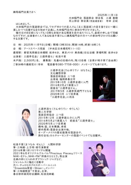 大田稲門会落語部会から11/9(日)に開催される同会主催の落語会への鑑賞依頼が届きましたのでお知らせします。練馬稲門会会員の松浪千紫さんが出演します。