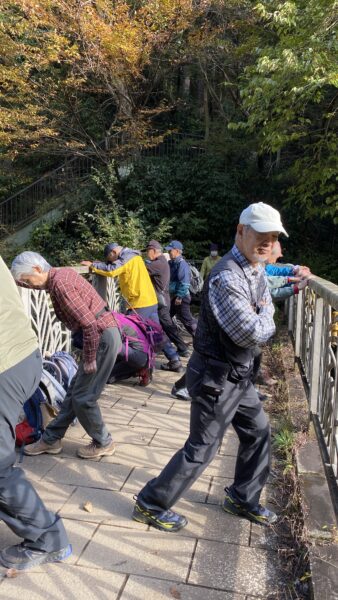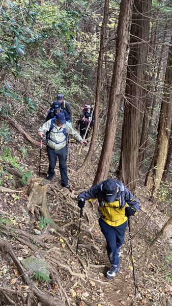 大垂水峠の登り口には広いスペースがなく他のグループが出発した後、国道20号にかかる橋の上で準備体操をする。大洞山までは標高差150mを一気に登る。今回のコースでは1番の登りになる。