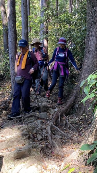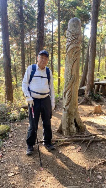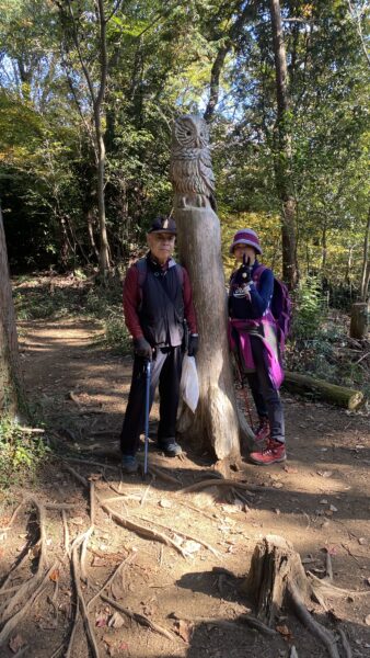 泰光寺山は健脚組が登り、他の人は巻き道を通り下で待つ。見上げるような階段を下ってくるのが見える。いくつかの本道と巻き道の合流地点に、1本の木から彫られた木彫りのフクロウがある。